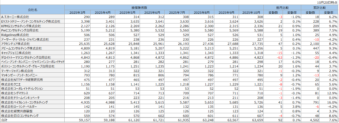 2025年3月から10月にかけて、主要コンサルティングファームの在籍者数(被保険者数)は一貫して増加基調を維持しています。特に8月・9月の採用拡大期を経て、10月は小幅な伸びに転じ、前月比+92名(+0.1%)と安定した推移を示しました。