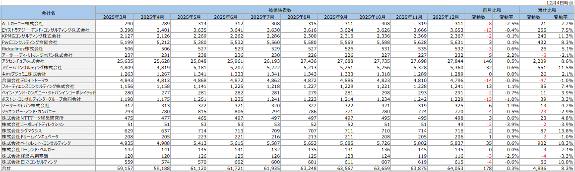 12月時点では前月比+0.3%(+178名)増加し、年間累計では+4,896名(+8.3%)の純増を記録。この記事では、2025年を通じた採用・人材戦略の動向を分析します。